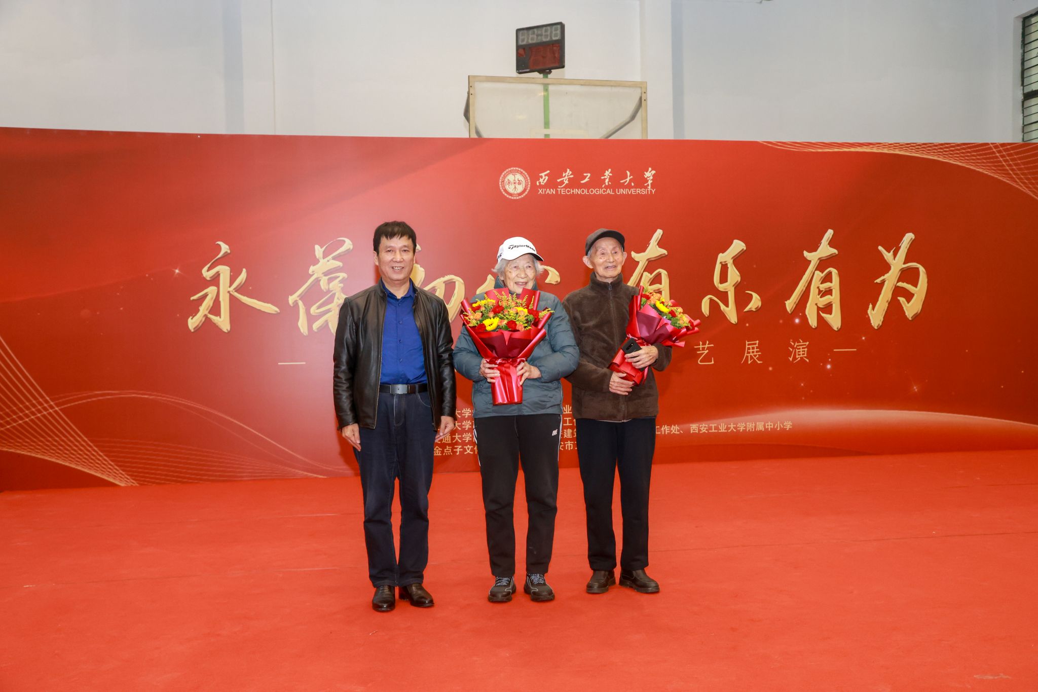 文艺展演还设置了为90岁以上教师代表祝寿环节。刘发林为90岁李育静和96岁蔡振华教师伉俪送上鲜花和祝福,并代表学校党政向全体老同志致以节日的问候。