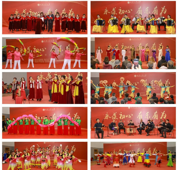 演出在离退休教职工合唱队激昂雄壮的大合唱《我爱你中国》中正式拉开帷幕。整场汇演节目形式多样,内容丰富,集歌唱、舞蹈、乐器演奏、柔力球、模特表演等多种艺术形式于一体,十余个精心编排的节目依次精彩亮相。